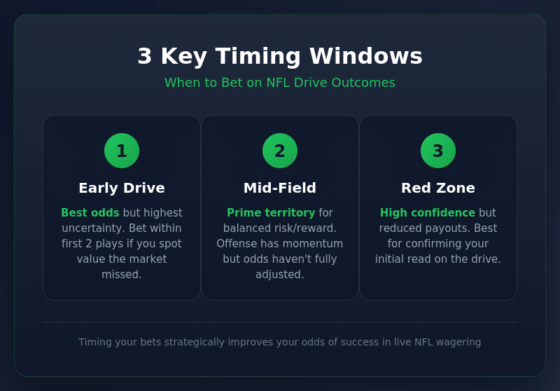 The best time to bet on an NFL drive outcome often falls somewhere between the initial snap and the red zone. Betting too early means accepting more uncertainty, while waiting until the offense reaches scoring position typically means accepting diminished odds.