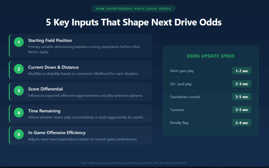 - Sportsbooks rely on official NFL data partnerships and proprietary algorithms to calculate next drive odds within seconds of each play