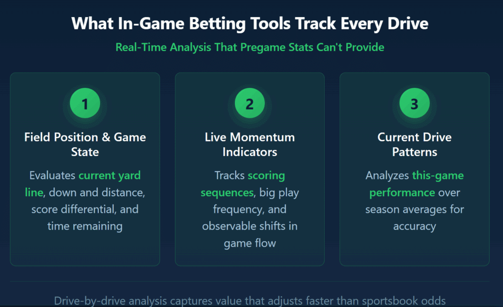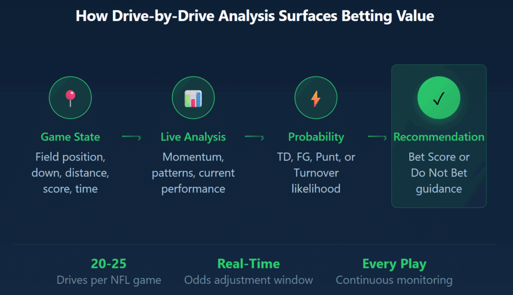- Drive-by-drive suggestions help bettors capitalize on in-game opportunities that sportsbook odds may not fully reflect